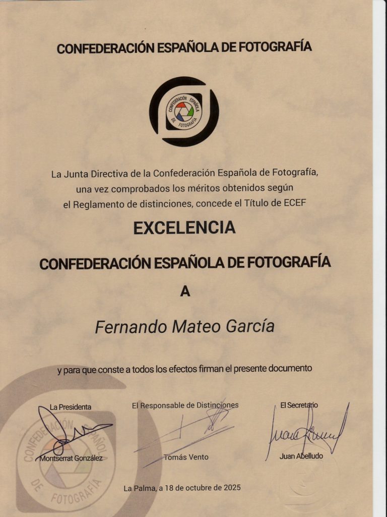 Nuestro socio, compañero y amigo, Fernando Mateo, ha logrado la distinción de la Confederación Española de Fotografía por la cual se le otorga el título de “Excelencia“, en base a los méritos contraídos según el Reglamento de Distinciones de dicho organismo.